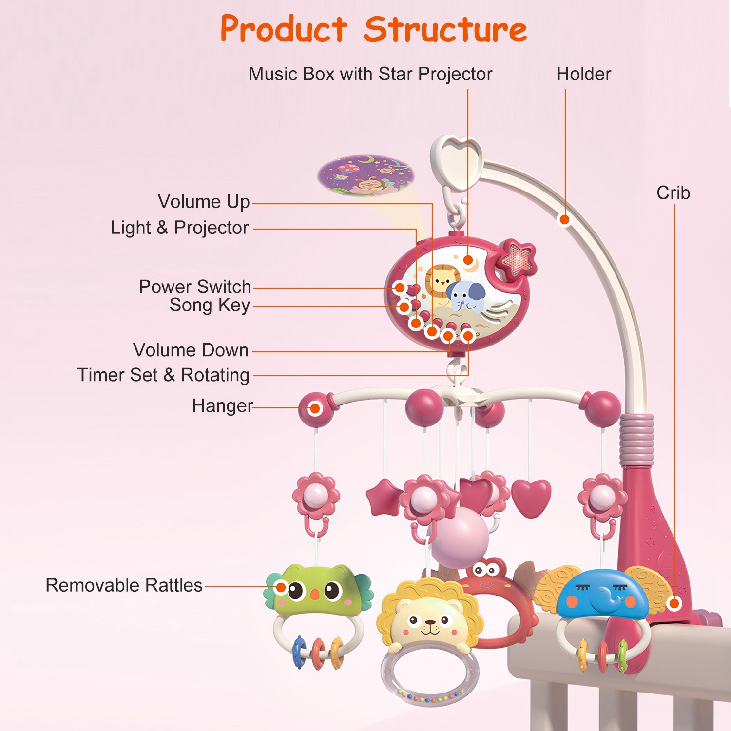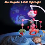 *Star Projector & Rotating Rattles*:This baby nursery toy can project stars,moon and animals. The music box and colorful rattles are 360° rotatable,improving your baby’ s perception of color and motion.