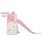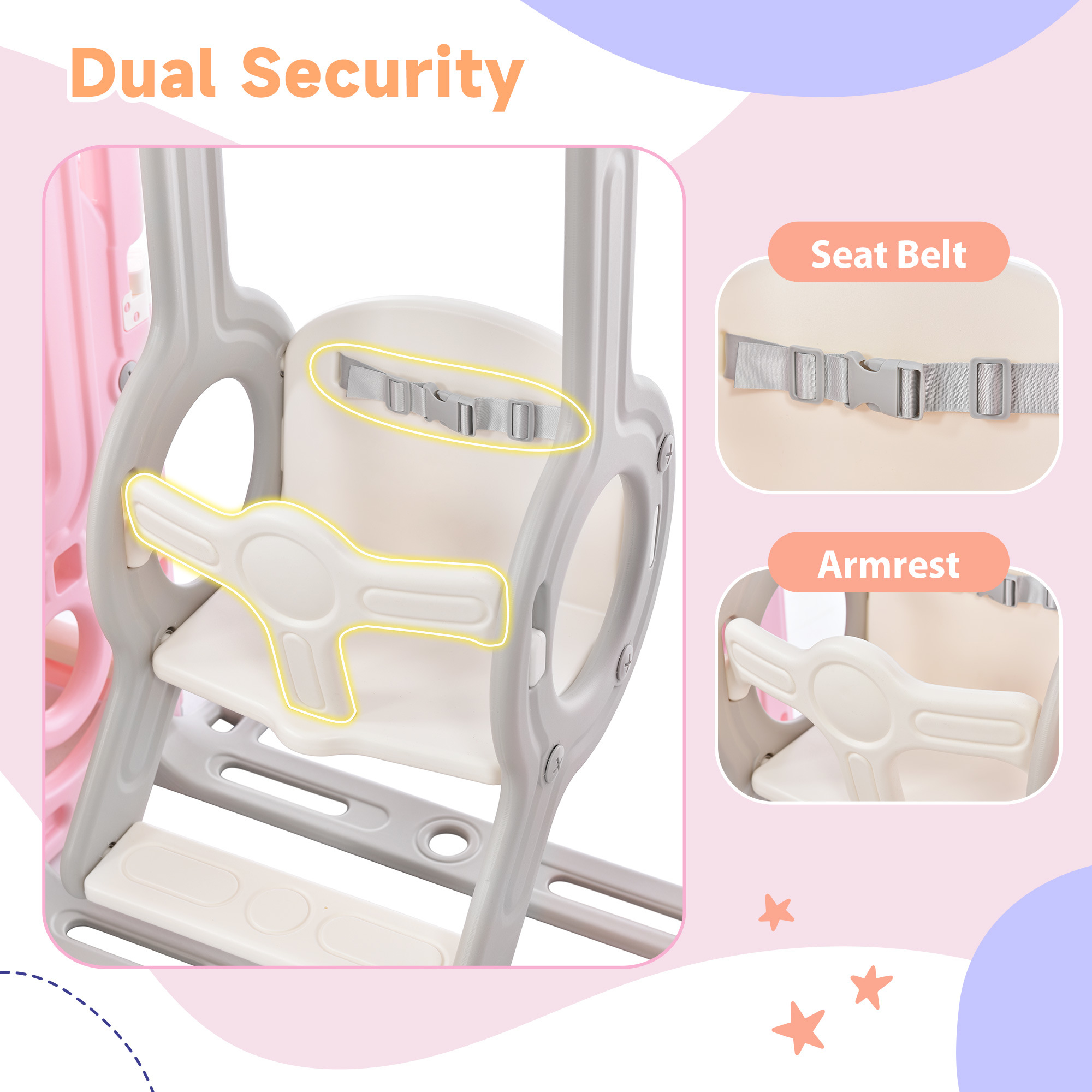 [Children's Playground 5-in1] Refreshing styling design! Delicate and cute freestanding swing and slide set for toddlers with three functional parts: 1 slide, 1 climbing ramp, 1 swing, 1 basketball hoop, and 1 hidden space for toy storage. This set allows children to completely release their playful nature, and they can play with their friends for hours!